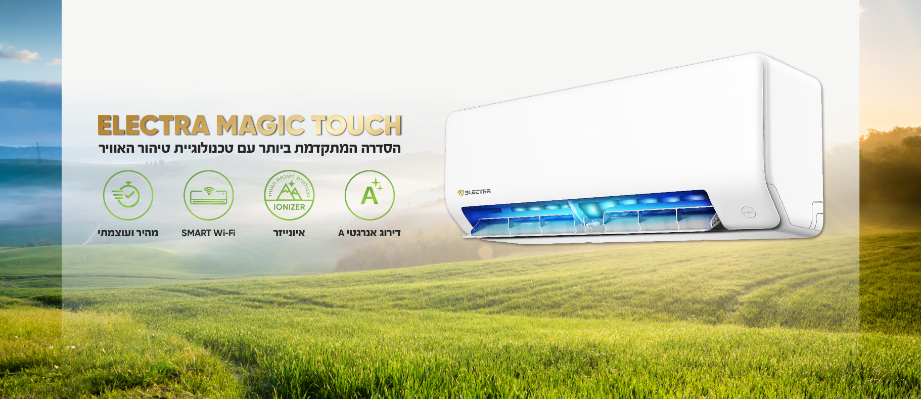 מזגני Magic Touch מצוידים במערכת להשבחת אוויר עם מרכיב איונייזר, המפחית עד 95% מכמות החיידקים והבקטריות שבאוויר. מערכת זיהוי מתוחכמת המותקנת במזגנים, מאפשרת להתריע על תקלה בזמן אמת – עם אפשרות לתיקון התקלה מרחוק. בעזרת אפליקציית Electra Smart תוכלו לשלוט על הטמפרטורה בביתכם מכל מקום ובכל זמן.
